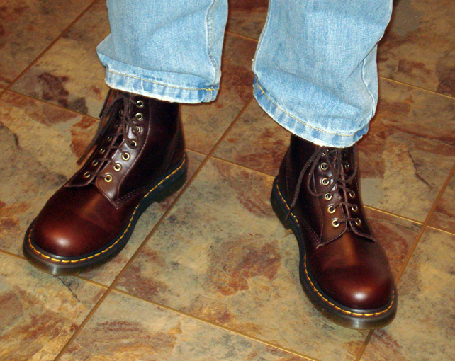 Things didn’t go too bad today. Kathy rang this morning and in dealing with the issue of not being down on the list to see Mr Catton until 04 Jan 10 and needing another Endoscopy to stretch the oesophagus she’d squeezed me in on the end of the list for this Friday so he could dilate it some more to enable me to almost get the darn turkey in whole and to be able to have a bit of a chat with him, sedation allowing, about the pain management and how thing are supposed to progress between now and say Christmas. So again I’ll get Jane to come with me as far as she can, she may even be allowed to sit in on the procedure which would be fantastic and then we’ll see what happens from there. I needed another ’keep yer tabs warm beanie’ which I purchased from Blacks in Vicci Centre, it’s half fleece lined so it doesn’t itch like mental, Miriam is sporting one of hers just to get her picture taken with me and that oh so wonderful pair of Doccers in dark tan they’re just a size 8 now they’re made in India or wherever it is I’d usually be a size nine. I remember we used to meet on a Saturday morning just to all sit and polish them, oxblood was the favourite or the natural colour they were meant to be until they had outlived their usefulness then like my brother he’d spray them silver or they’d be modified in some other way as to impress the rest of the gang! Please check out the JustGiving Page, I’ll try and get Barry to show the offline donations as well but remember any amount is more than appreciated, I haven’t defrosted the horses head yet but I am keeping tally of how shall I put it “any tight knackers”! |